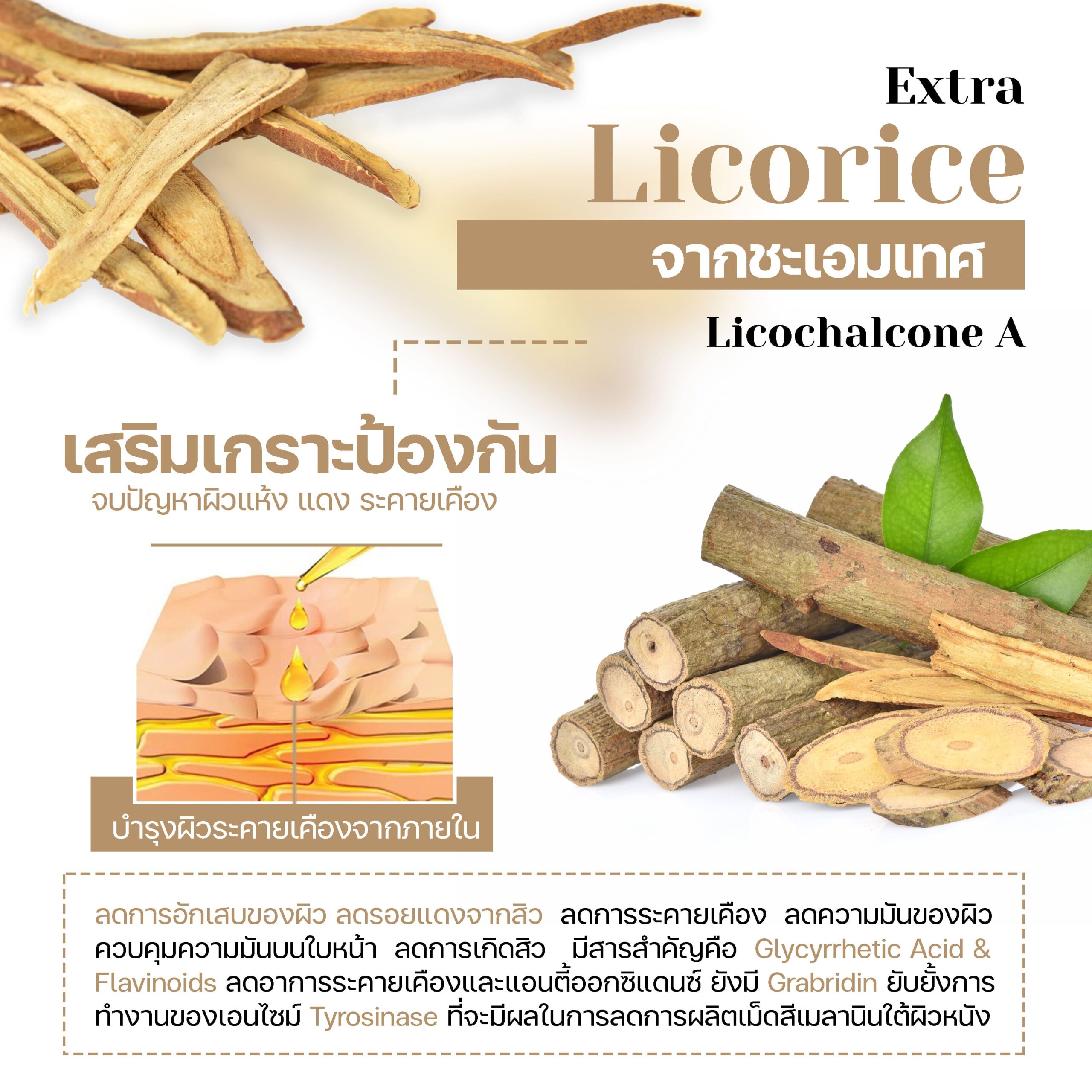 - คุณสมบัติ: มี Glabridin ที่ช่วยลดการอักเสบ ลดรอยแดง และช่วยให้ผิวสว่างกระจ่างใส